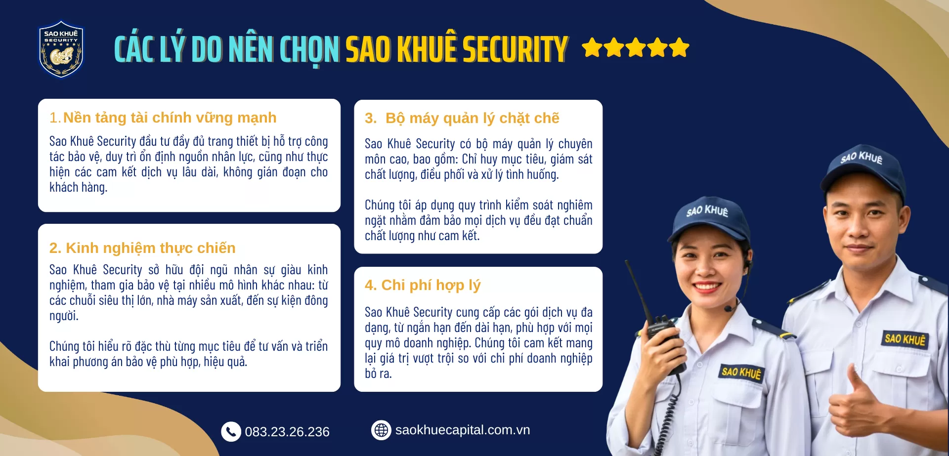 Với tầm nhìn rõ ràng, đội ngũ chuyên nghiệp, dịch vụ đa dạng và quy trình bài bản, Sao Khuê Security sẵn sàng là người bạn đồng hành đáng tin cậy của quý khách hàng trên hành trình xây dựng một môi trường an toàn – ổn định – bền vững.